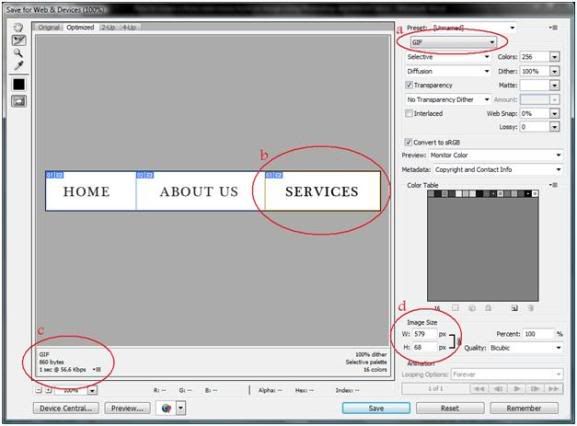 c. The size of the image and time for loading each of these images is shown according to the format chosen. The above image shows the size and loading time if these slices are saved as GIF.