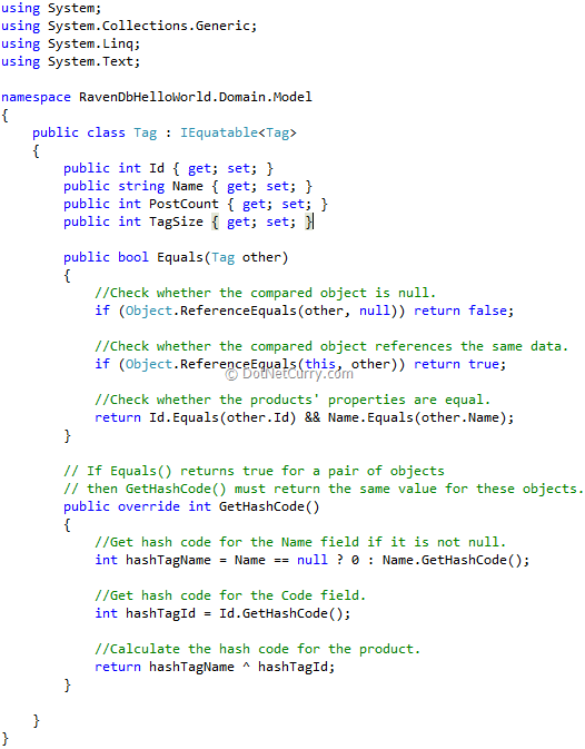 d. In the above code, we implement Equal functionality to return true if the Id and the Name of the tag are the same. As we have learnt, since the wee days of dot net, if you have a custom Equals method you should override GetHashCode and make sure you provide unique hash codes yourself. Hence we have overridden the GetHashCode method as well.