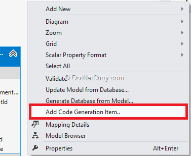 Since we designed the DB Schema first, we’ll use the Entity Framework EDMX Designer to reverse engineer our data layer. Once we have the DB Diagram we right click on it and add the Code Generation T4 file EF5.x Db Context Generator. This T4 template ensures the entities generated via the EMDX are EF Code First compliant.