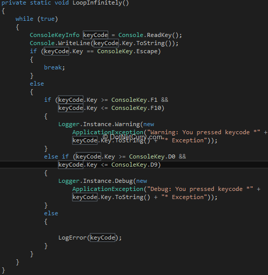 We will simply log key-strokes as input at the Console window and depending on type of keys pressed, throw exceptions with different methods. We end the execution when users presses the Escape key. The code for this is in the LoopInfintely() method shown below.