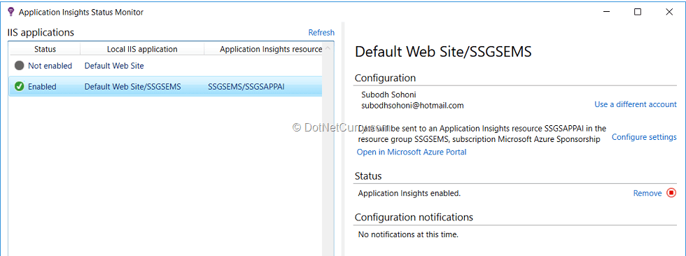 Once it is installed, we need to configure it on IIS by providing details like our Azure Subscription, Resource Group name and the Azure Application Insight resource that we have created earlier. We need to selectively enable it for various web applications that we require to monitor.