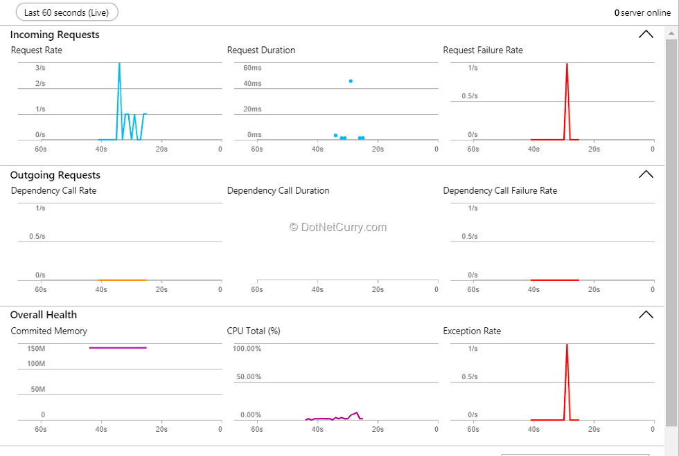 Live Metrics: It is the streaming view of the various parameters that are monitored by Application Insights. It shows the parameters for incoming requests, outgoing requests (outside the application) and overall health of the application along with its environment.