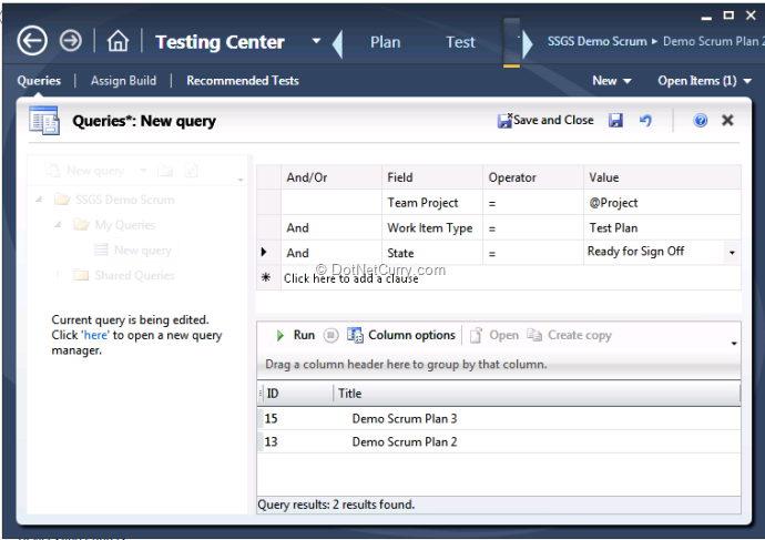 The query fetches all the Test Plans which are in ‘Ready for Sign Off’ State. This query can be stored for further use. We can even create an ad-hoc report using Report Builder for this new functionality.