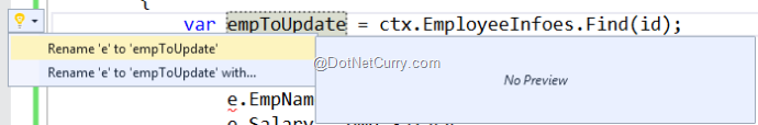 The variable ‘e’ is used to represent the searched employee based on the id. In order to provide a friendly name here for ‘e’ e.g. empToUpdate, rename ‘e’ to empToUpdate. Once the rename is done, the following code change will be displayed:
