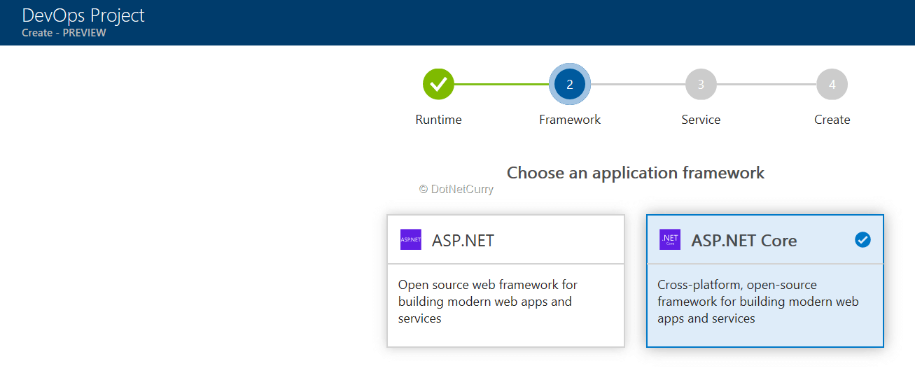 Doing so starts a wizard to fetch the details for creation of DevOps project. Click on the Create button in this wizard.